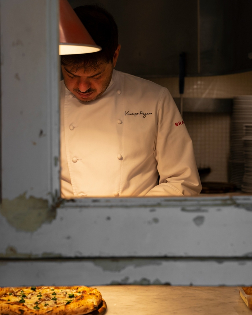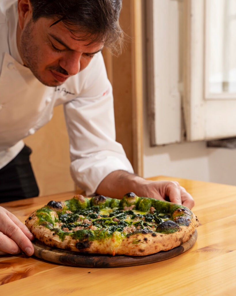 L’impasto, frutto di un blend di farine grezze di Molini Fagioli e Molino Naldoni, è lavorato con cura per garantire leggerezza e digeribilità. Il forno a gas, visibile dalla sala, conferisce alle pizze una cottura uniforme e un cornicione croccante.