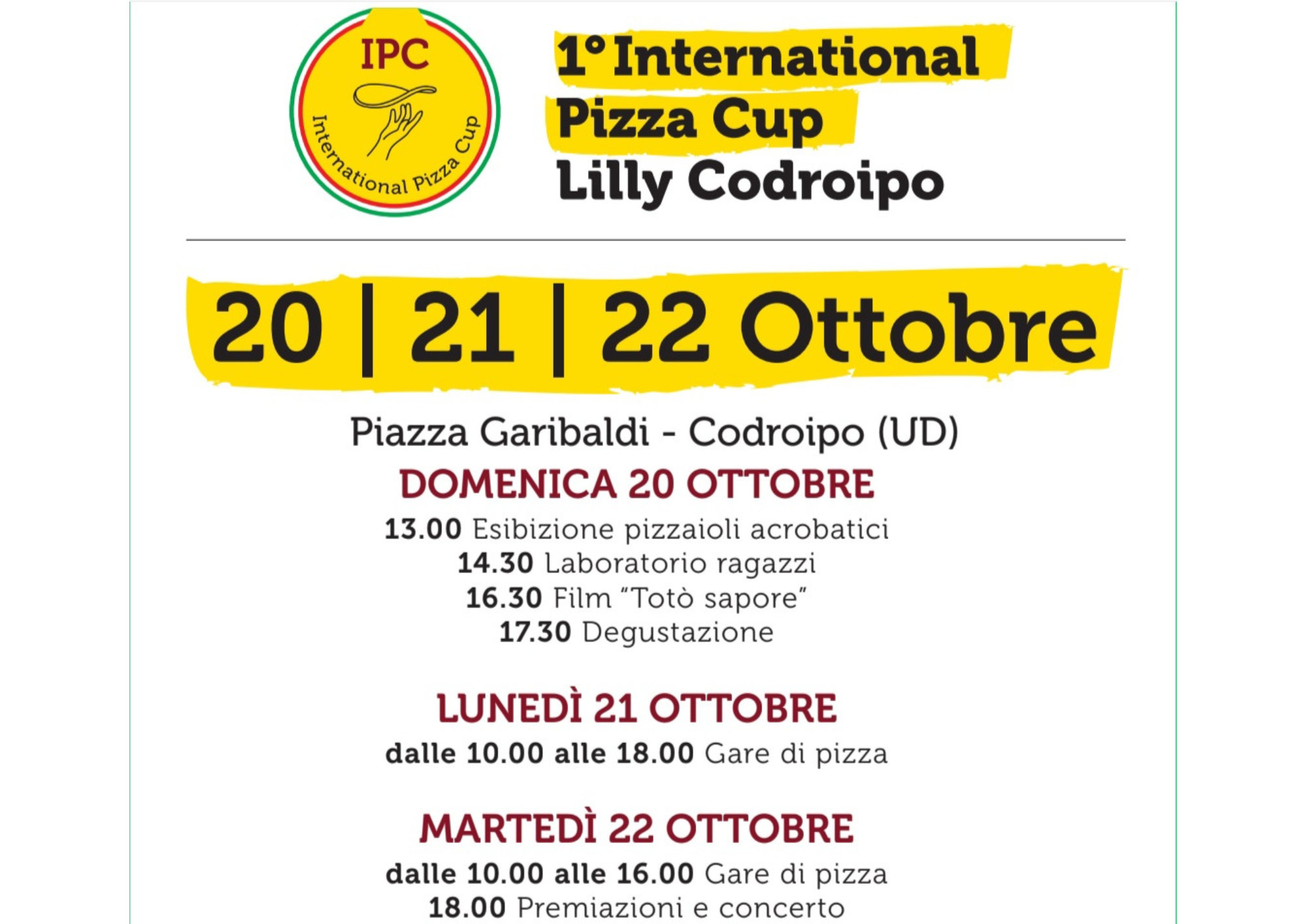 Siamo lieti di annunciare il 1° International Pizza Cup Lilly Codroipo, un evento imperdibile per tutti gli amanti della pizza! Questo straordinario festival si terrà dal 20 al 22 ottobre in Piazza Garibaldi a Codroipo (UD). Tre giorni dedicati alla celebrazione della pizza in tutte le sue forme, con esibizioni, laboratori, gare e tanto divertimento per tutta la famiglia.