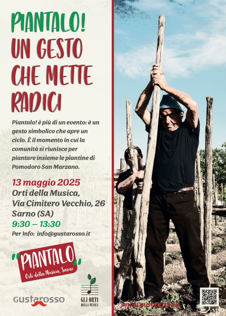 Il 13 maggio 2025, gli Orti della Musica di Sarno torneranno ad animarsi con un evento unico nel suo genere: “PIANTALO! – Metti le mani nella storia, coltiva il futuro”, promosso da Gustarosso – DANIcoop. Un’iniziativa che affonda le radici nella tradizione agricola della Valle del Sarno per celebrare uno dei gesti più simbolici e significativi del ciclo produttivo del Pomodoro San Marzano DOP: il trapianto delle piantine.